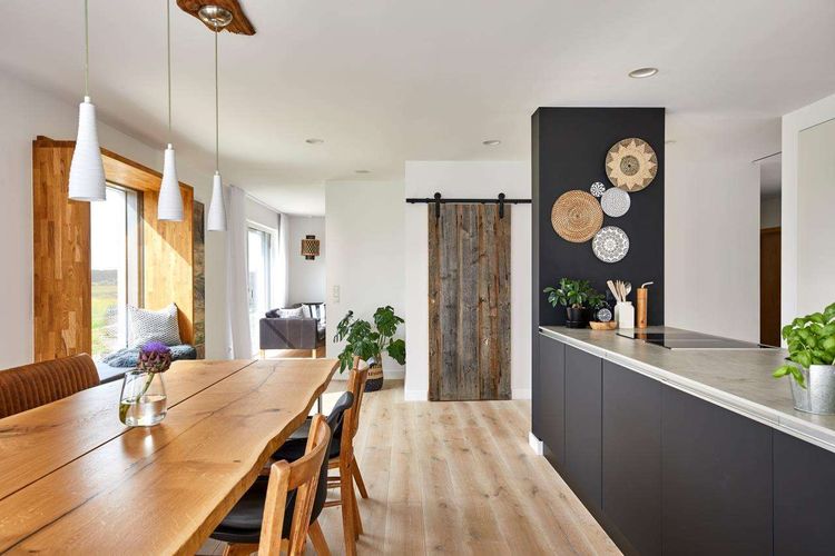 Stilelemente, wie bspw. die im Ess- und Küchenbereich montierte Altholz-Schiebetüre auf Gusseisen-Beschlägen, die den Abstellraum unter der Treppe verschließt, die Design-Hängeleuchten in Beton-Optik im Elternschlafzimmer oder auch der massive Esstisch aus Eiche, verleiht dem modernen Haus seinen unverkennbaren Charakter und unterstreicht die Vorliebe der Bauherren, mit naturverbundenen Materialien zu spielen.
