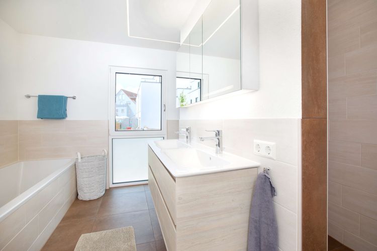 Im Dachgeschoss befinden sich die Rückzugsräume der Eltern. Neben dem Hauptschlafzimmer mit separater Ankleide haben auch die Erwachsenen ihr eigenes Badezimmer mit Waschtisch, Dusche und WC. Des Weiteren gibt es noch ein Arbeitszimmer. Highlight ist die rund 26 qm große Dachterrasse, die zu ausgiebigen Sonnenbändern einlädt.